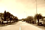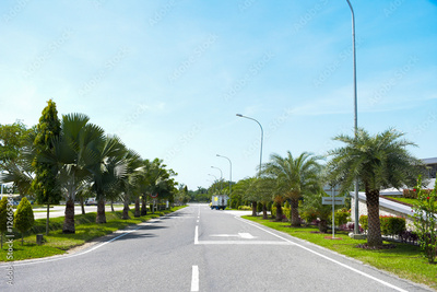 Tropical road lined with lush palm trees, bright greenery, and streetlights under a clear blue sky at Kualanamu International Airport office area.