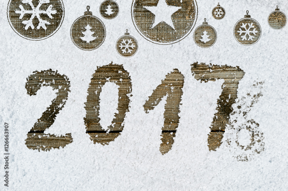 christmas card or new year background made of xmas symbols handwritten on snow and wooden table