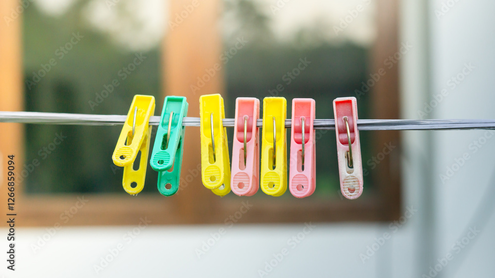 Colorful Plastic Clothespins on a Clothesline with Blurred Window Background