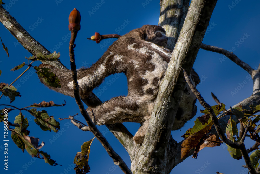 A three-fingered brown-throated sloth (Bradypus variegatus) in a tree in the Amazon rainforest.
