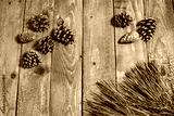 Xmas background on vintage wooden table red berrys and spruce