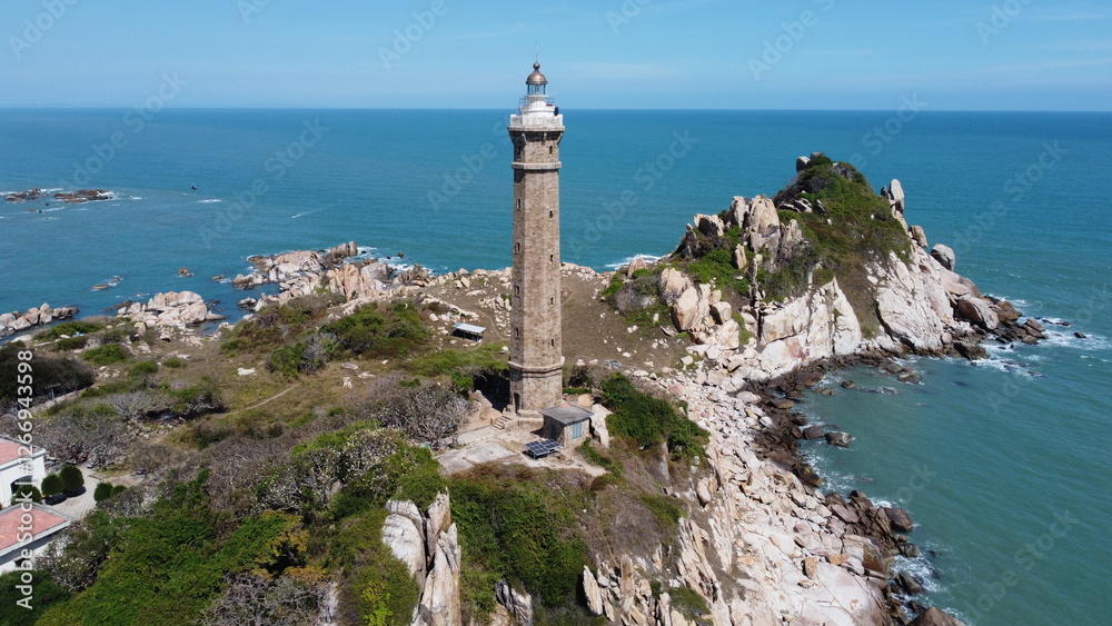 A tall, cylindrical lighthouse stands prominently on a rocky promontory overlooking a vast bay dotted with boats, under a clear blue sky.