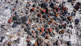 Red and black volcanic rocks creating a colorful pattern on the ground.
