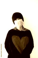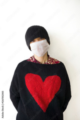 Young woman wearing surgical mask and heart sweater is posing against white background