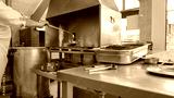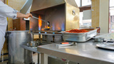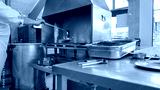 Chef pouring red pepper flakes into a pan on a gas stove with flames in a restaurant kitchen.