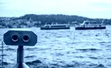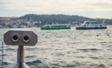 Binoculars offer a closer look at the maritime traffic on the Bosphorus Strait in Istanbul, Turkey