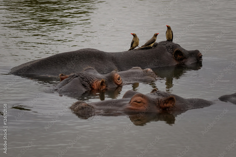 Bathing Hippopotamus (Hippopotamus amphibius) & Red-billed Oxpeckers (Buphagus erythrorhynchus) - Sabi Sands Game Reserve, South Africa
