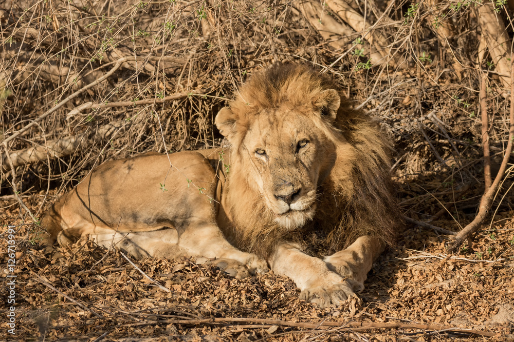 Mature African Lion (Panthera leo) Lying in Early Morning Sunlight - Sabi Sands Game Reserve, South Africa