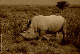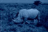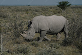 A beautiful White rhino is walking in the savannah bushes in the Namibian Etosha National Park.