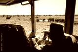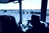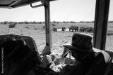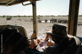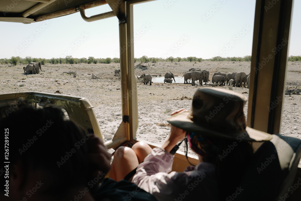 People sitting in the safari car near watering hole and watching group of elephants bathing and drinking water in the savannah in the Namibian Etosha National Park.