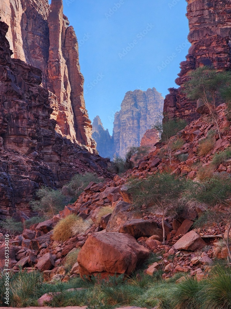 A rocky canyon in Saudi Arabia, with a small tree clinging to the rocks. The canyon walls are a mix of red and brown, and the sky is a clear blue.