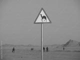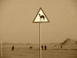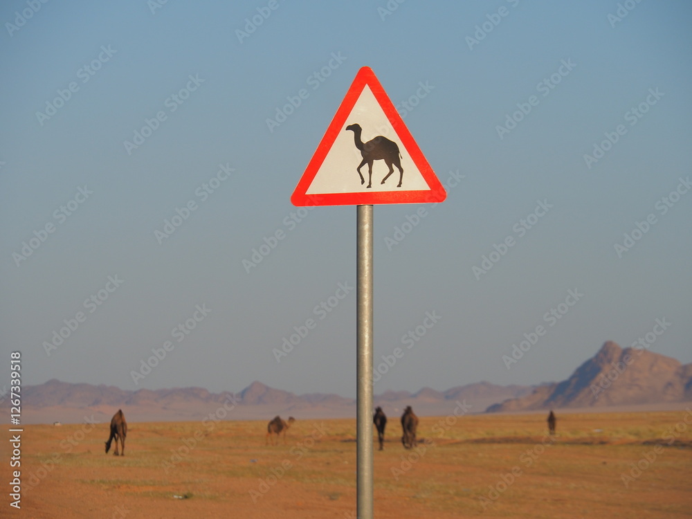 A bright yellow sign in the desert warns of camels crossing the road in Saudi Arabia, with a clear blue sky and rocky mountains in the background