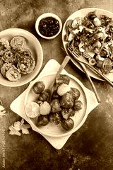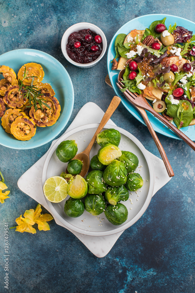 Thanksgiving dinner. Roasted brussel cabbage, butternut squash and salad.