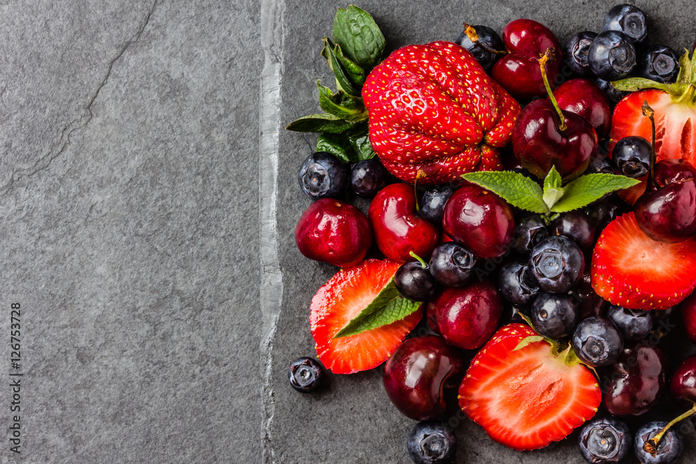 Berry mix - strawberries, cherries, blueberry on stone slate background