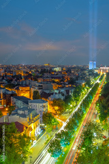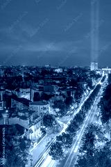 Photo taken from the Victoria Square at sunset after a summer storm. Dramatic city scene with rays of blue light.