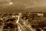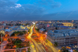 Aerial view of capital city Bucharest, Romania. University Square at sunset with traffic lights.