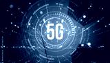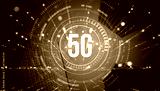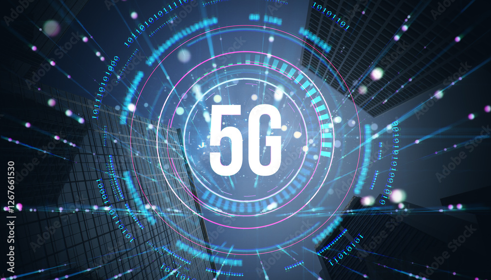 Futuristic 5G technology digital interface with glowing holographic elements.