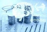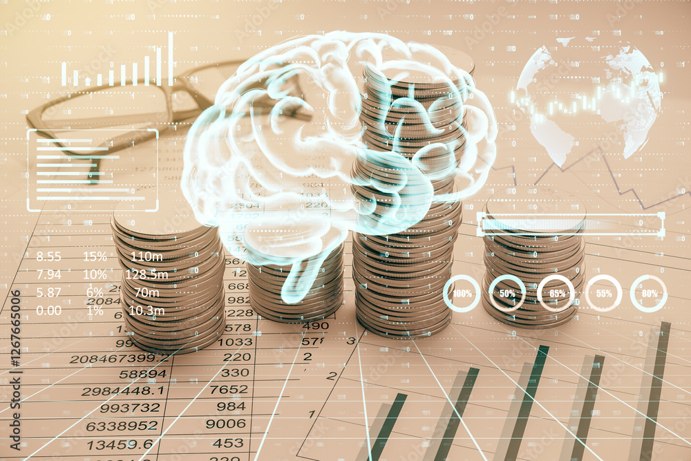 Futuristic concept of artificial intelligence in finance with glowing brain over stacked coins.