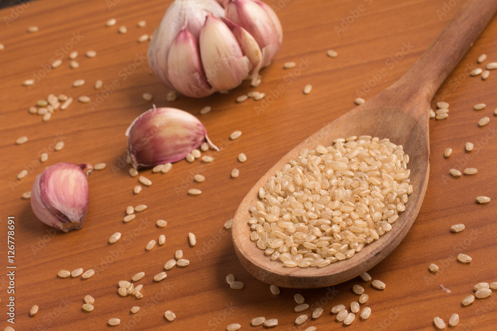 Integral Rice into a spoon. Wholegrain. Cateto