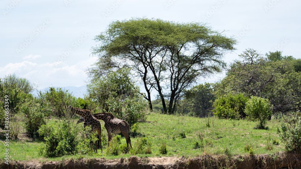 Giraffes are Grazing Gracefully Under a Tree, Surrounded by a Beautifully Lush Landscape Tarangire National Park Tanzania Africa