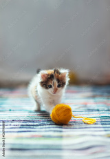 portrait of a cute little kitten standing in a room on a rug and playing with a yellow ball of thread