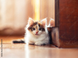 cute little scared kitten lying in room and reflected in shiny closet and floor