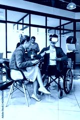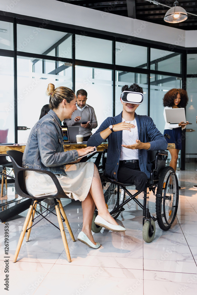 latin young man in wheelchair using virtual reality glasses and working at office in Mexico Latin America, hispanic coworkers or teamwork in concept of disability