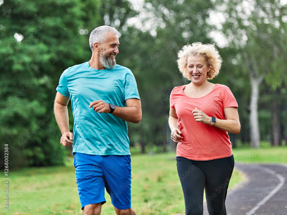woman mature man outdoor running couple sport together jogging healthy mid adult nature fit active exercise fitness run park middle age