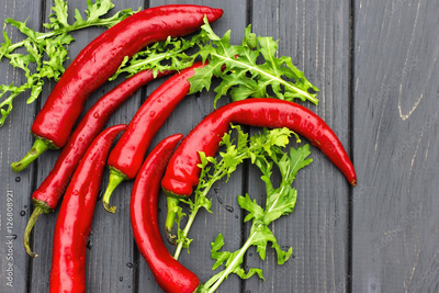 chilli peppers and arugula, lying horizontally
