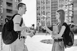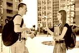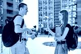 College students teenagers guy and girl with backpacks talking together, outdoor