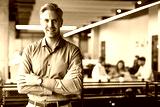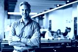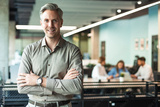 Handsome successful businessman looking camera hands crossed friendly chief standing at modern office indoors. Colleagues working on the background
