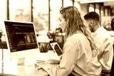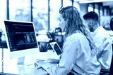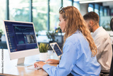 Businesspeople in formalwear working on laptop and PC in the modern office.
