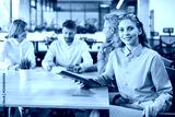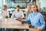 Attractive young businesswoman sitting on the table, looking at camera with colleagues on the background