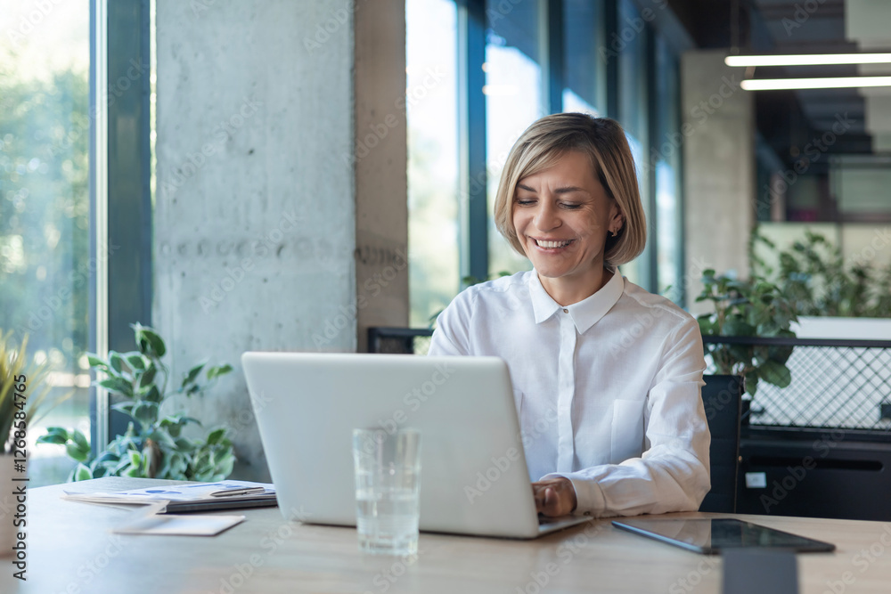 Smiling stylish mature middle aged woman sits at desk with laptop, sitting at office table.