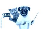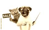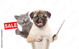 Happy cat and Pug puppy look at camera. Dog points away on empty space. Kitten shows signboard with labeled "sale". isolated on white background