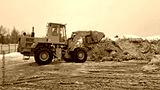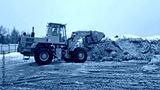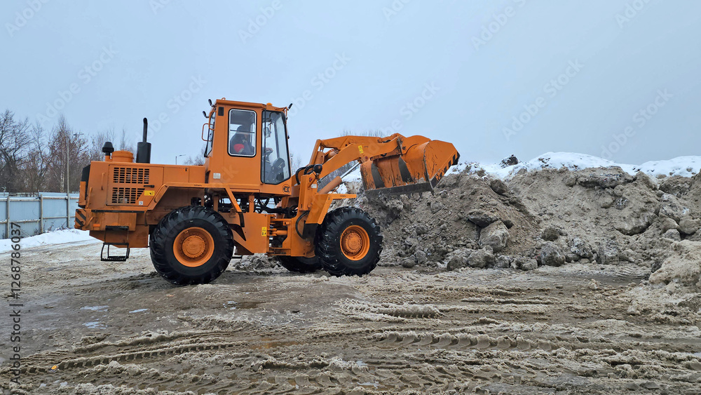 A heavy-wheeled excavator is loading collected dirty snow from the streets into a snow-melting machine