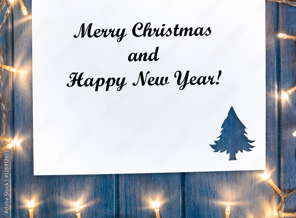 Cut paper in fir-tree shape with decorative lights for christmas card or new year background on blue wooden table