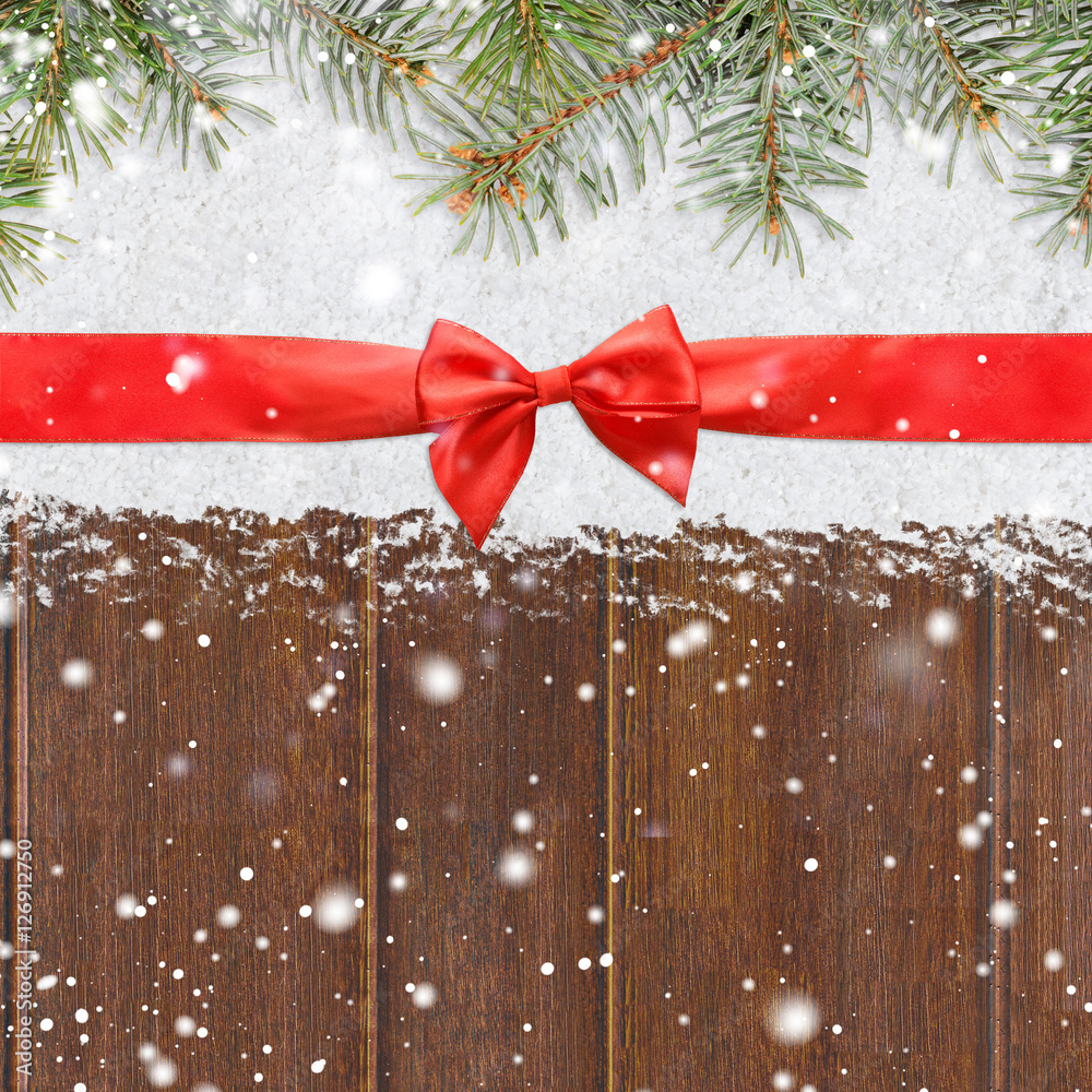 christmas card or new year background made of red satin ribbon with bow on snow and fir-tree branches over wooden table