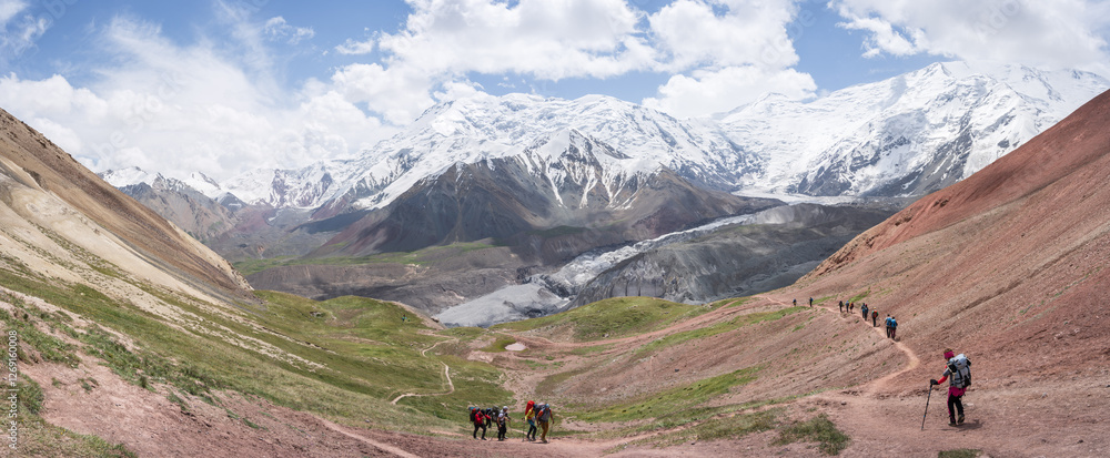 Panoramic view on alpine landscape with glaciers and snowy mountains with hiking tourists, Pamir