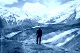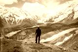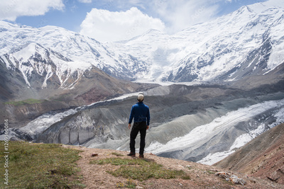 Young man enjoying views on glaciers and snowy mountains in front of him,Pamir mountains, Kyrgyzstan