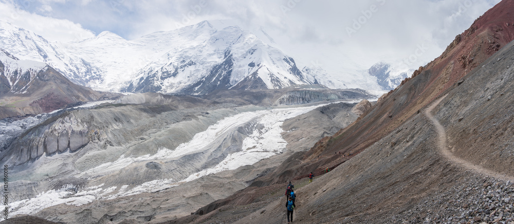 Wide panorama of valley glacier and snowy peaks with tourists hiking, Pamir mountains, Kyrgyzstan