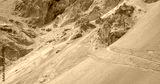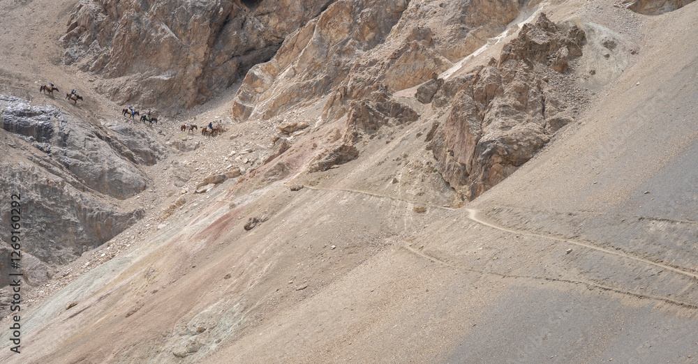 Riders with cargo horses descending through dry and dusty alpine terrain,Pamir mountains, Kyrgyzstan