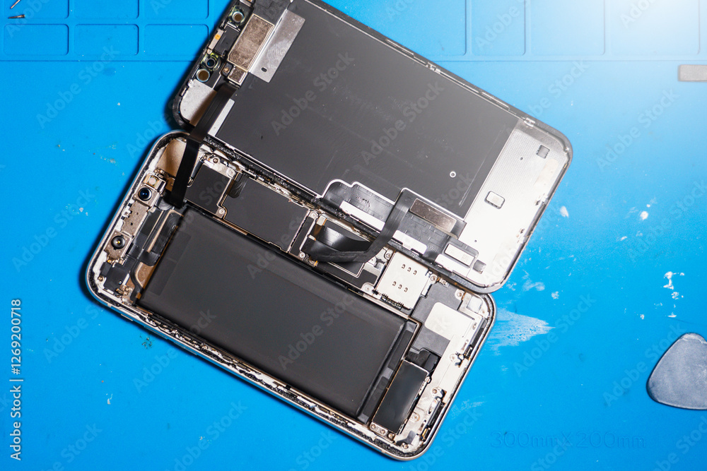 Phone repair process on a workbench with tools and smartphone components displayed