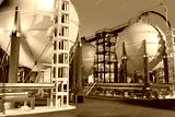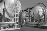 Large spherical storage tanks supported by blue steel structures are part of an industrial facility. Pipes and platforms indicate a complex system for gas or liquid processing 3d image
