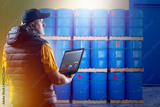 Barrels of gasoline near man. Fuel tanks on pallets. Worker with laptop inside oil warehouse. Supervisor keeps track of barrels of gasoline. Oil storage worker in cap. Man prepares fuel for shipment