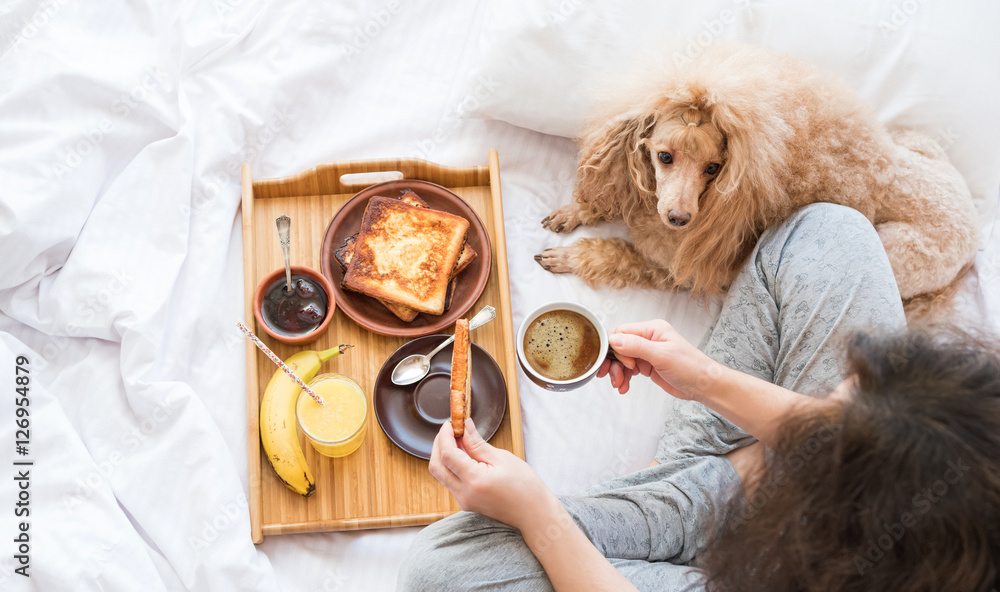 Young woman with her dog in a bed. Breakfast in bed - french toasts with a cup of coffee.