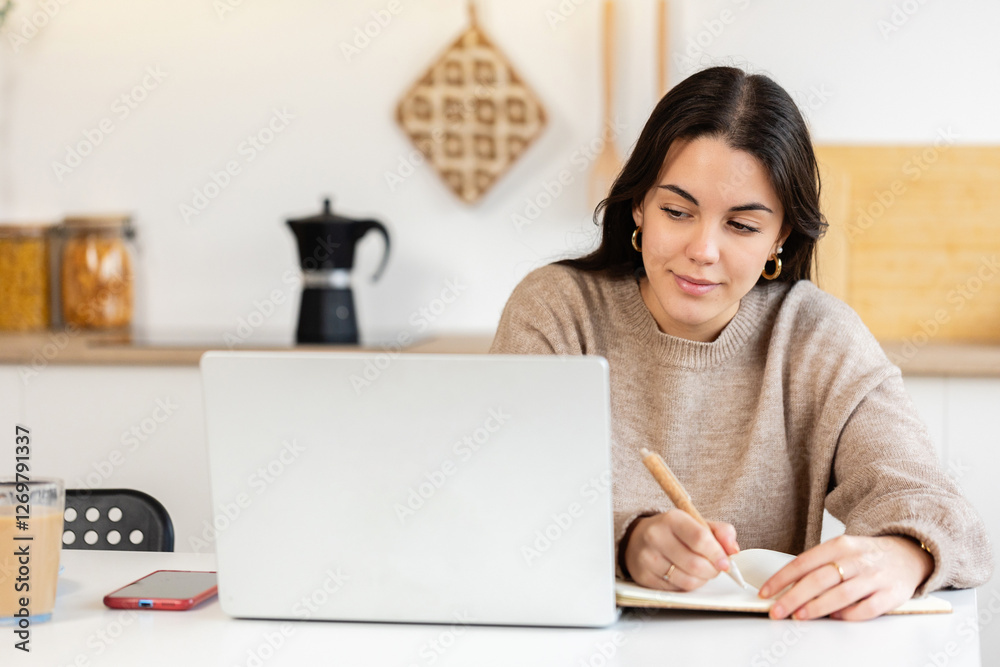 Young adult student woman taking notes while using laptop computer in the kitchen. Millennial female learning online listening virtual video call. Business and education concept.