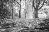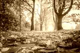 Fallen leaves, autumn colorful park alley in Krakow, Poland