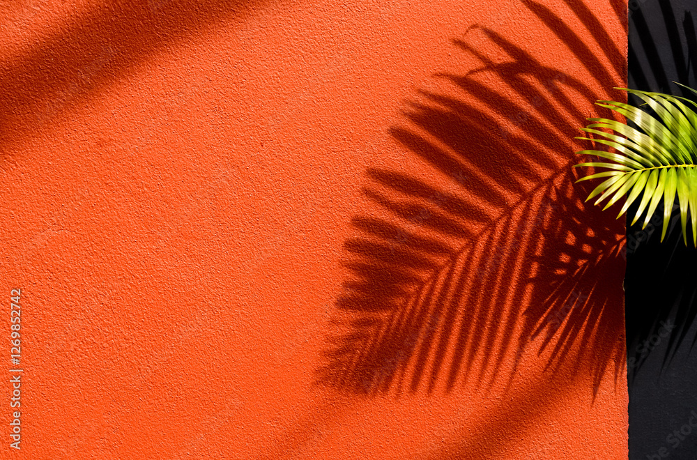 Orange background with Tropical palm leaf shadow, light overlay on concrete wall texture for Product display.Natural leave silhouette on architecture exterior aesthetic. Creative boho summer vibes