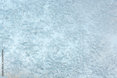 The intricate patterns of frost on a glass surface, creating a delicate, icy texture against a softly blurred background